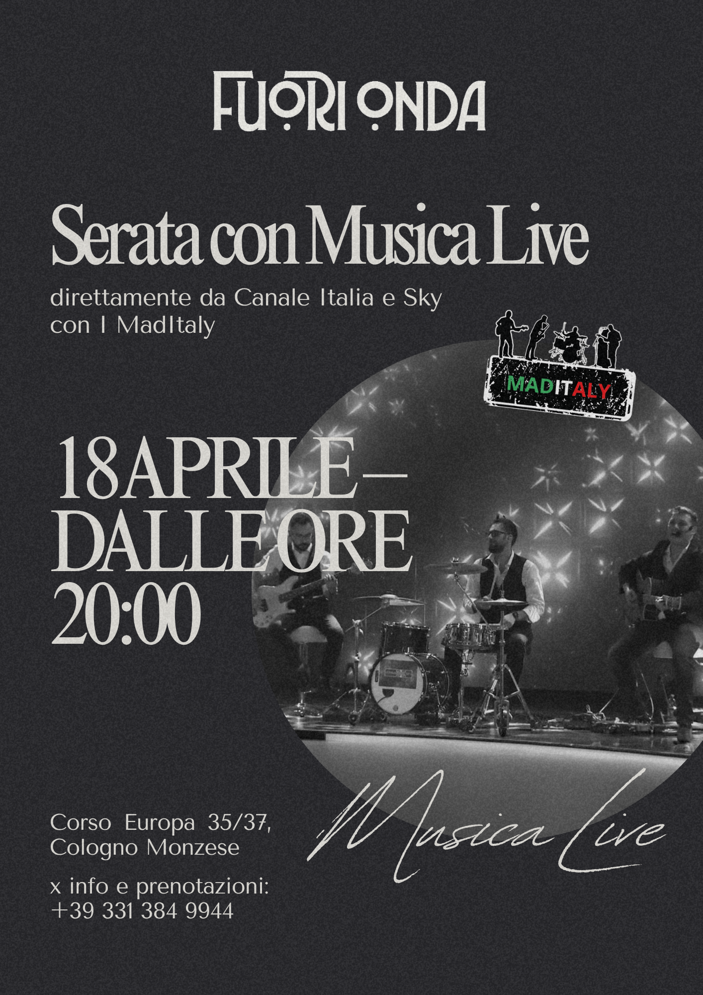 Sul palco I MadItaly, una band che non passa inosservata. Con un repertorio che attraversa i grandi successi dagli anni ’70 fino ad oggi, riescono a coinvolgere tutti, trasformando la serata in un’esperienza da vivere, non solo da ascoltare.